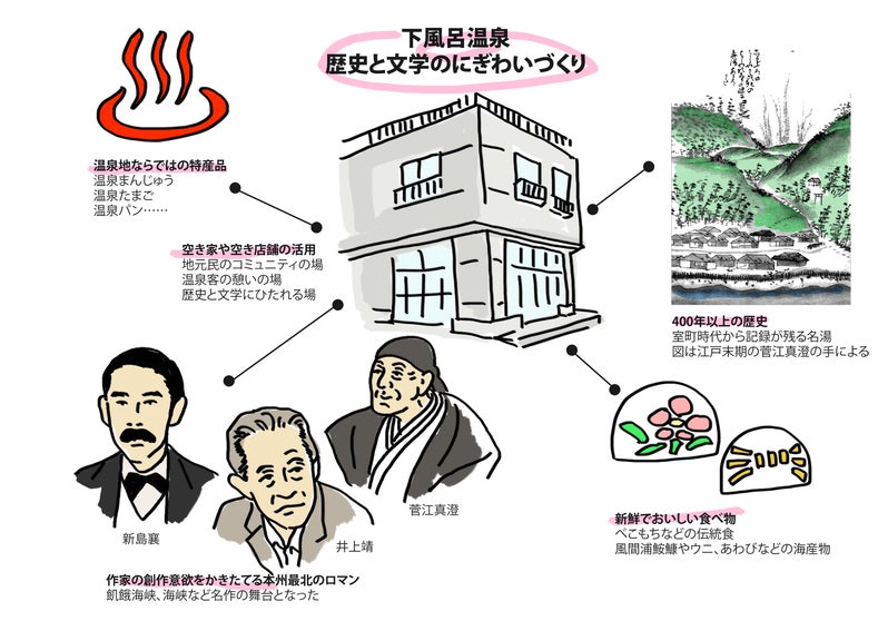 津軽海峡に面し、夏はイカ、冬はアンコウなどの海産物を楽しめる下風呂温泉は、泉質の良さもあいまって、現在も根強いファンの方に支えられています。しかし豊かな自然とは裏腹に、飲食店はあるものの、カフェや喫茶店がないので、温泉街をそぞろ歩きした後はホテルや旅館の部屋にこもりきりになりがちです。