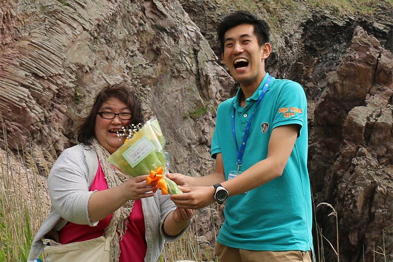 プロジェクト達成の翌日、むつ市ジオパーク推進員の平田さんと石川さんが花束を持って来てくださいました!8月に現地審査を控え、お忙しいのに本当にありがとうございます。