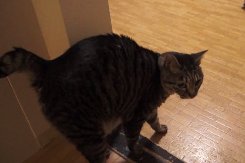 すみません、ワイがただならぬ気配を発してしまったのか微妙に警戒した姿勢と表情になってますが、ふだんはとっても人懐っこい猫さんです。
