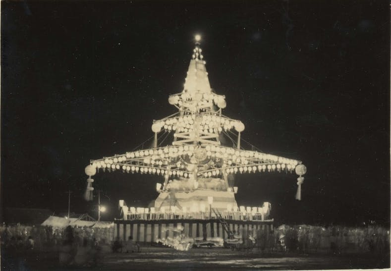 昭和34年(1959年)、盆踊りの回転やぐらは、それまでの人力式から電動式に変わります。盆踊り会場にモーター駆動の電動式回転櫓が組み立てられ、静かに櫓が回転し始めると、見ていた何人もの人が『万歳』を叫んだといいます。(下段、「盆踊りの歴史②」を参照ください)