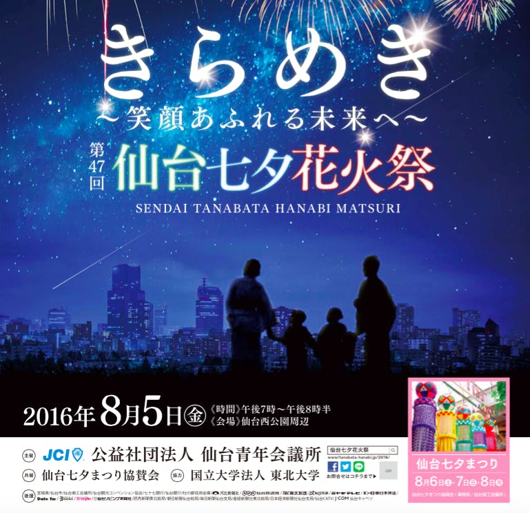 本年度の第47回仙台七夕花火祭は「き ら め き ~笑顔あふれる未来へ~」をテーマに、市民の皆様にパートナーとして実際に運営への参加から街頭募金の協力まで、様々な形で参画頂きながら開催いたします。本年度は昨年の地下鉄東西線開業後、初の開催となるため、安全面を最大限考慮し、仙台市民と全国から訪れた方々に観覧して頂きます。