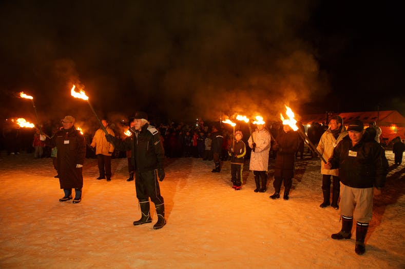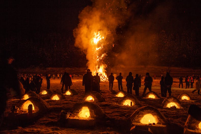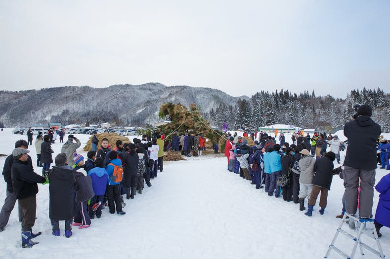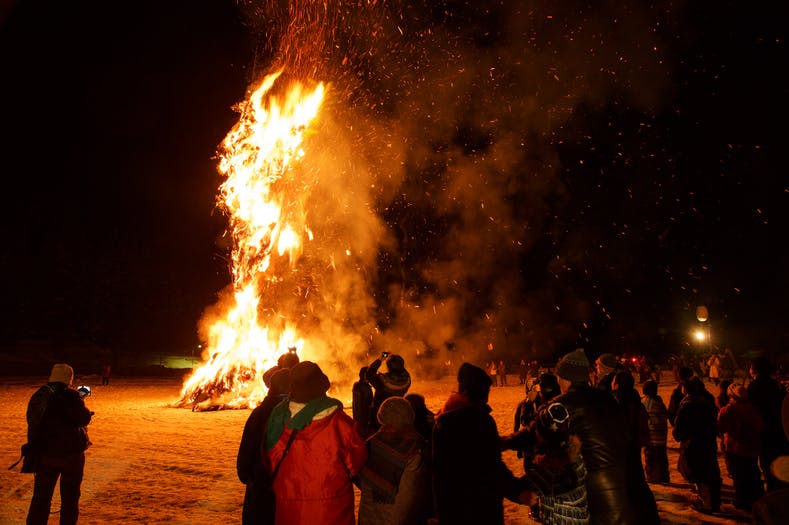 稲ワラを巻きつけた高さ10mを超えるご神木が点火され、赤々と夜空に立ち上がる。その炎に向かい約500名の観客は「おおー、かまくらのごんごろう!」と叫ぶのが特徴の奇祭。その迫力には圧倒されます。