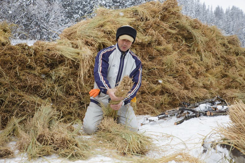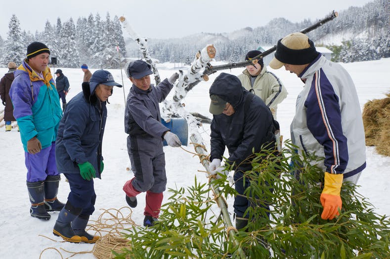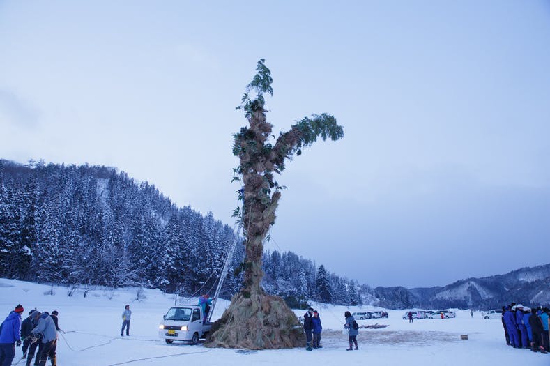 会場へ運び終わったら、ご神木の栗の木に稲ワラや豆ガラ、竹などを巻き付けることで高さ10メートル、重さ2トンを超えるご神木を作り上げます。