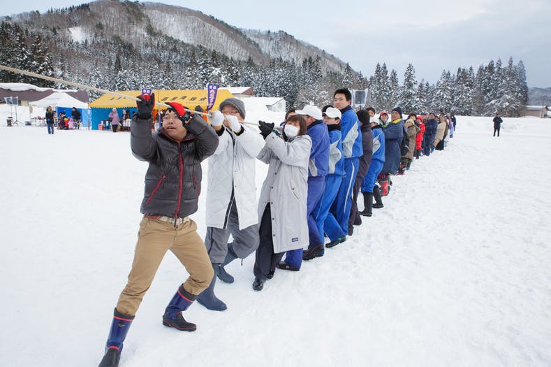 このように、様々な歴史と伝説が残る「おさるべ地区」ですが、そのなかの葛黒集落は、昭和30年代には約50世帯もあったのにもかかわらず、今では過疎化が原因で半数しか残っていません。そのため、マンパワーとまつりに使用する稲ワラの確保が難しく、「火まつりかまくら」は休止を余儀なくされました。しかし、15年間休止されていた行事は、「おさるべ元気くらぶ」の呼びかけによって、平成26年に復活を遂げました。復活した「葛黒火まつりかまくら」は「ごんごろう」の復活を合言葉に、まつりをみちのく秋田の小正月行事として定着させることを目指しています。さらに今後は