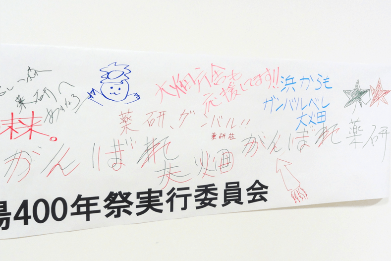 今回の応援メッセージは、イカす大畑カダル団とともに、ふるさとの未来に灯りをともすために取り組んでいる、「薬研温泉開湯400年祭実行委員会」の皆さんです!熱い応援メッセージを垂れ幕にビッチリ書いてもらいました!