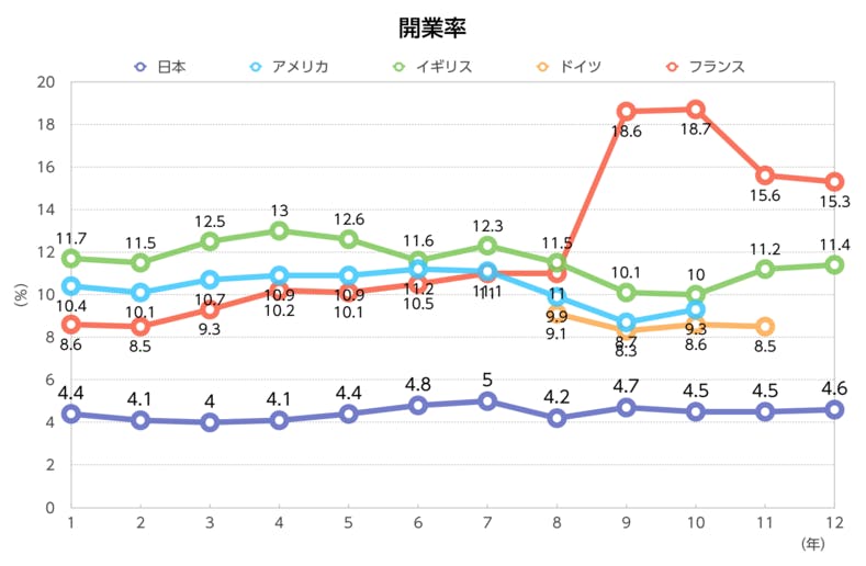 中小企業庁の公表データに基づいて、国際的に日本の「開業率」を見てみると、その低さが分かります。