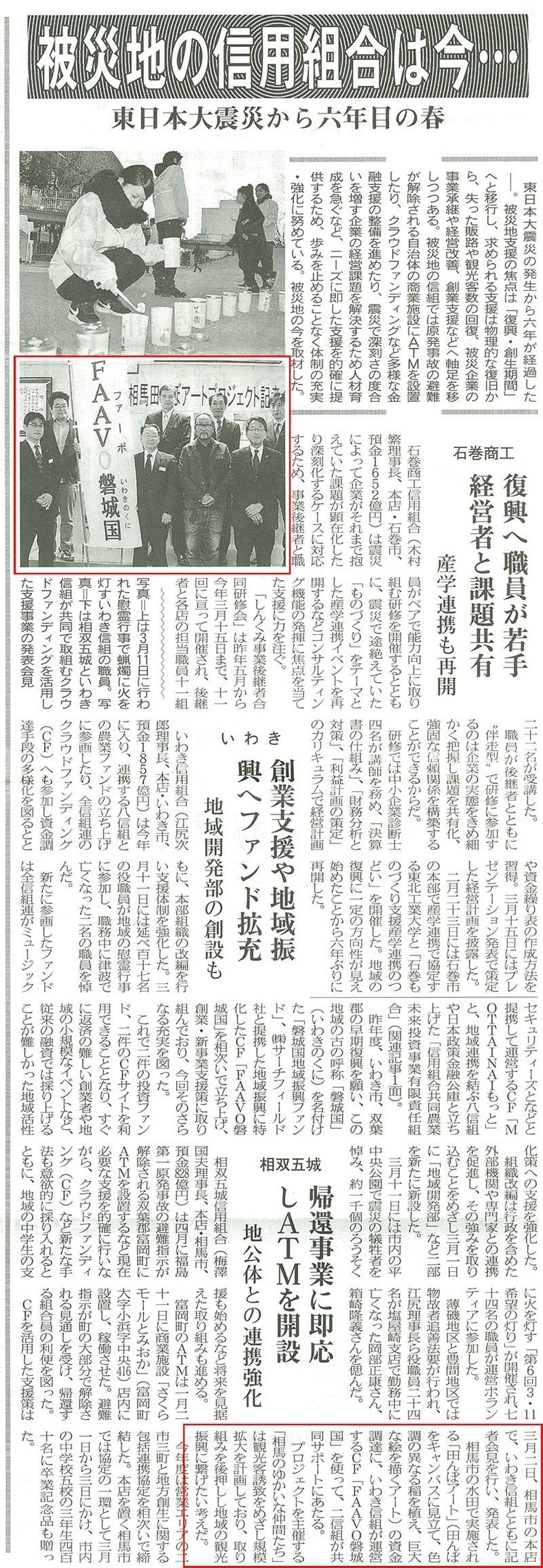 こちらで実施中のクラウドファンディングが、いわき信用組合さま、相双五城信用組合さまとの活動として、全国信用組合新聞(2017年3月15日 3面)に記事掲載いただきました。ありがとうございます。
