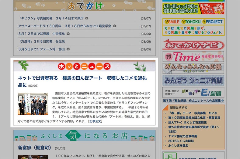 3月2日に行われました、相馬田んぼアートプロジェクトの記者会見が、2017年3月7日の福島民報さま22面(ふくしまは負けない明日へ)に掲載されました! ぜひお手にとってご覧ください。