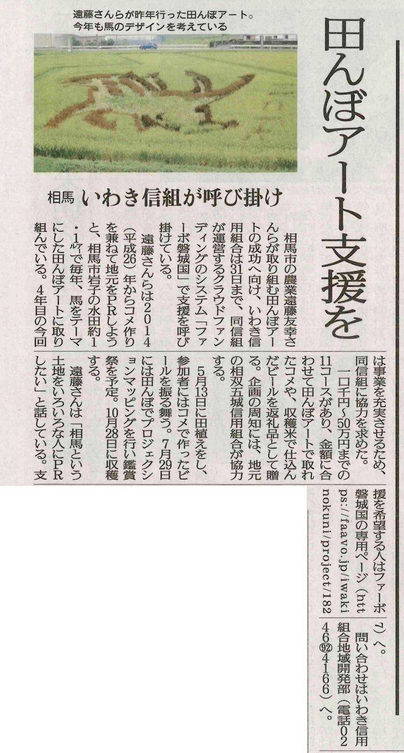 本日3/13、福島民友さま「HOMETOWNネット59(12面)」にて、わたしたち相馬田んぼアートのクラウドファンディングの記事を掲載いただきました! ありがとうございます!すでに遅い時間ではありますが、可能な方はぜひお手にとってごらんください。 わたしたちはたのしいイベントを作りたいとおもっているグループにすぎませんが、こうしてたくさんの方、いくつもの企業にご協力いただき、あるいは新聞社に記事にしていただいたりと、おおくの力をいただいています。本当にありがたいことです。 記者会見で他にお話ししたことについては、ぜひあらためてこちらをごらんください。記者会見:遠藤さんの話