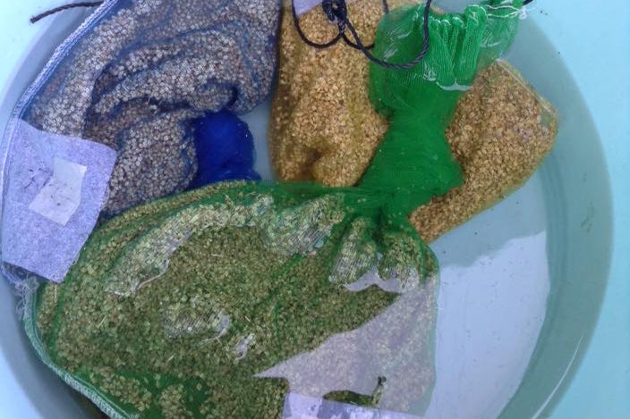 田んぼアートでつかう稲は6+1種類です。べにあそび、あかねあそび、ゆきあそび、黄大黒、緑大黒、紫大黒と、背景につかう普通の稲です。絵柄にあわせて量を調整して育てます。