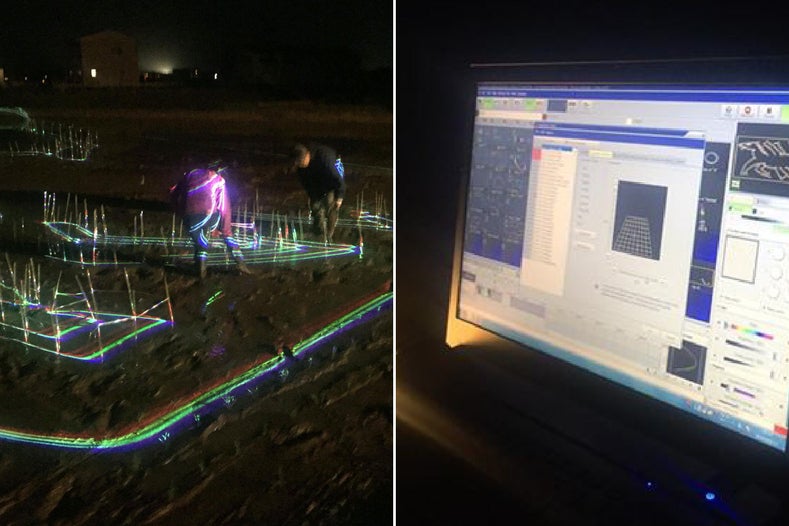 レーザーで田んぼに絵柄を投影して(独自の手法です!)、参加者のみなさんの田植えのガイドになる杭を打っていきます。