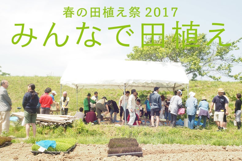 参加者みんなで田んぼに入って、手で田植えします。たのしい交流イベントもあります。