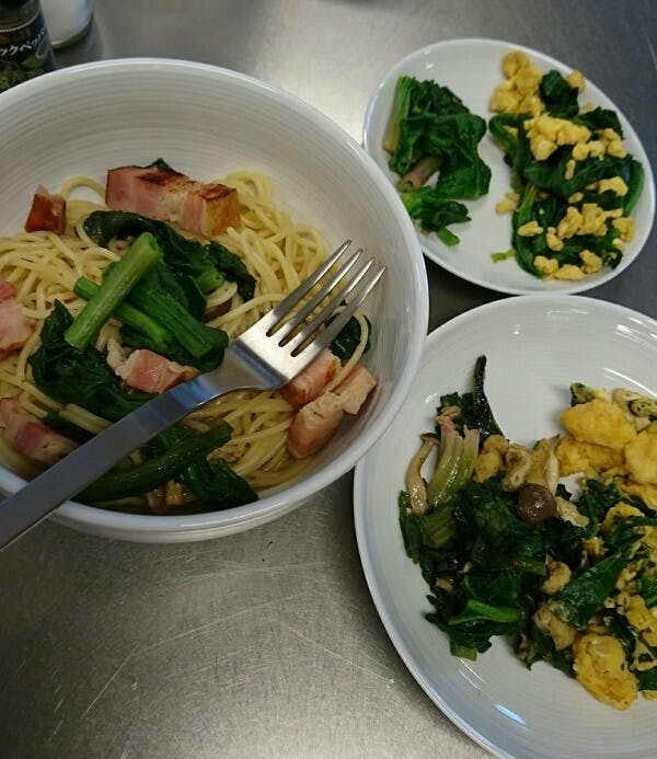 ほうれん草とベーコンのパスタ、ほうれん草としめじのバターソテー、ほうれん草のおひたし、ほうれん草の菜の花和え、ほうれん草入りスクランブルエッグ!!!