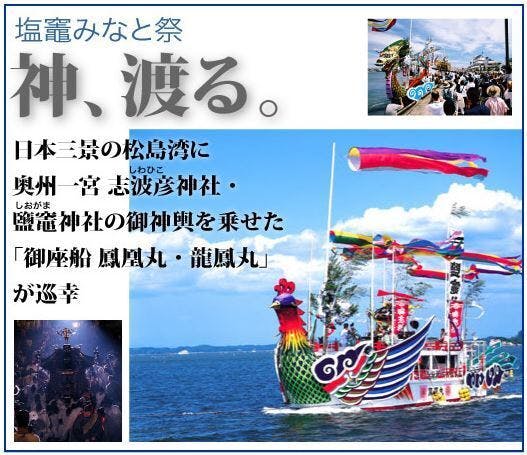 陸奥国一之宮鹽竈神社のお神輿を、御座船「鳳凰丸」に奉安し、日本三景の松島湾内を渡御するという、海の祭典としては全国有数の規模であり、百隻に及ぶ大小の供奉船を従えてご巡幸される姿は、さながら平安絵巻を見るようです。