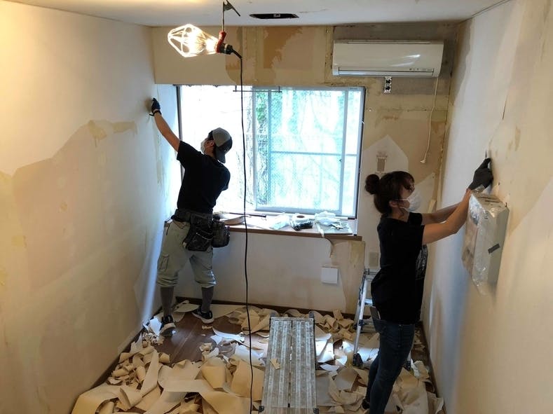 各客室の一部クロスも自分たちで張り替えています。