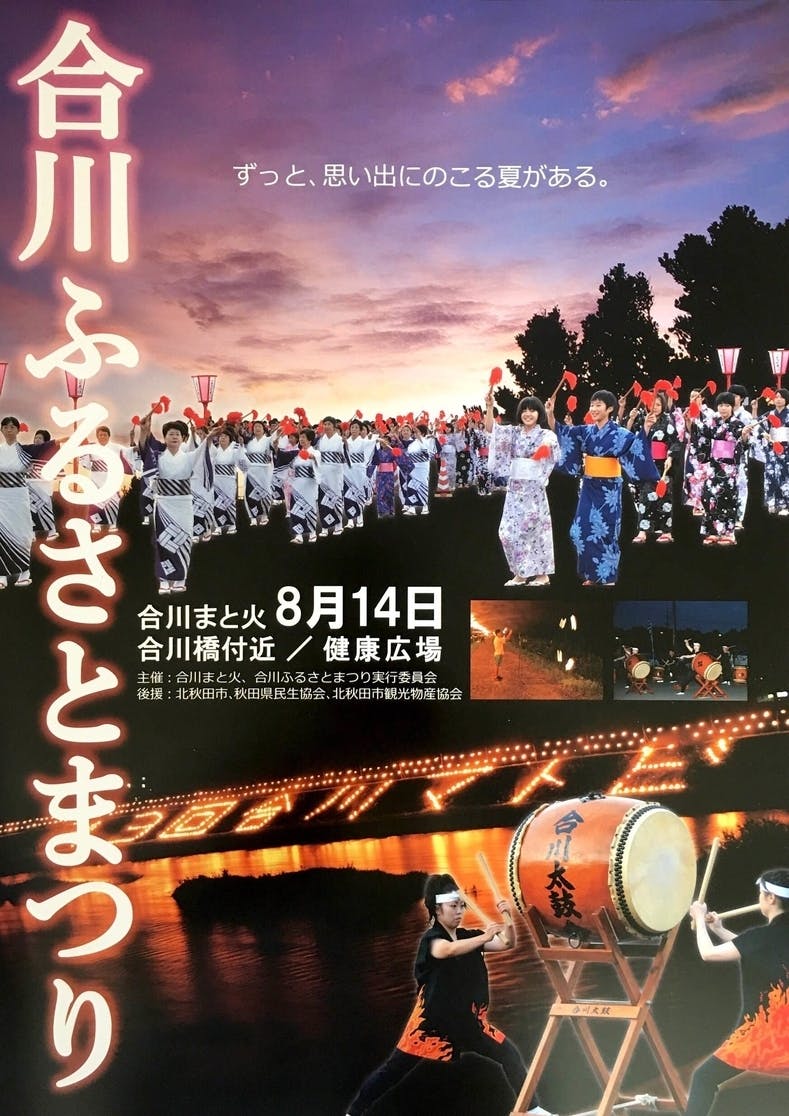 先祖を供養し、豊かで住み良い地域づくりを推進するため、また、ふるさとの伝統伝承文化の継承と発掘を行い、故郷愛の向上と地域の活性化を図るため、秋田県北秋田市の合川地区(旧合川町)で、毎年8月14日に開催している「合川ふるさとまつり・合川まと火」。
