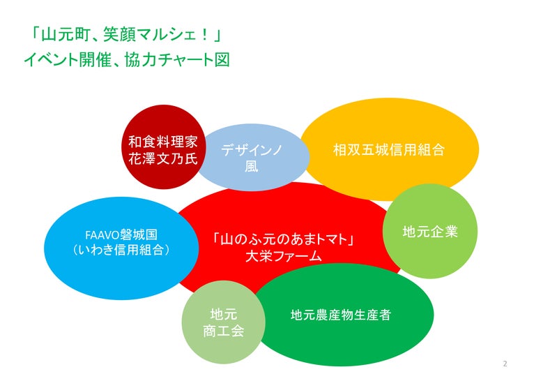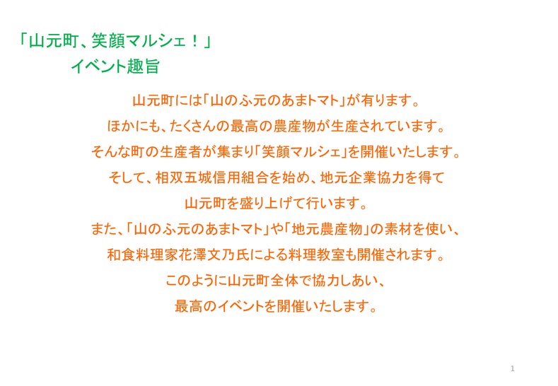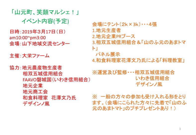 宮城県を中心に活躍している、和食料理家・花澤文乃先生による料理教室(試食会)を2019年3月17日(日)開催。トマトの魅力を存分にお届けする花澤先生の料理は必見です!午前・午後の部と共に参加者30名を予定しています。また、当日は一日を通して『山元町、笑顔マルシェ!!』を開催します!ご協力いただきました山元町内の農産物生産者様より、野菜や果物を販売する予定となっておりますので、ぜひ皆様お越しください。当社一押しのおすすめコースです!!