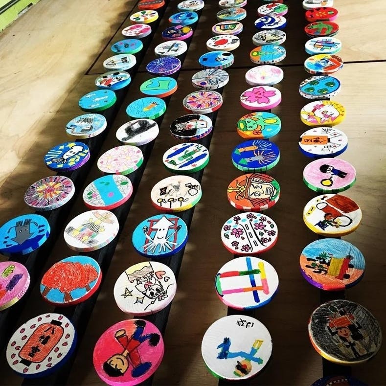 雨天の展示も考えて、400枚以上、すべてコーティングして、円形板貼り付け作業進行中です!!