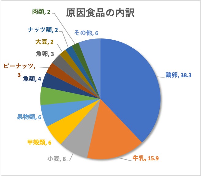 食物アレルギーの原因として最も多いのが鶏卵で、次いで乳になります。この2品目で全体の5割を占めます。どちらもタンパク質を含む栄養源であり、子供の成長には欠かせない食品ですが、アレルギーの原因もタンパク質で構成されているため、鶏卵と乳をアレルギーにもつ子供に食べさせることができません。