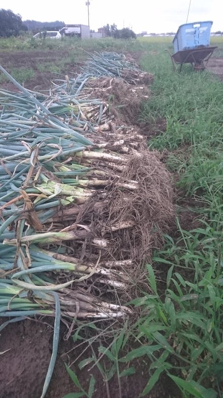 栽培中のねぎを一度抜き取り、斜めに寝かせて土をかける「やとい」を行うことにより、曲がったねぎになります。