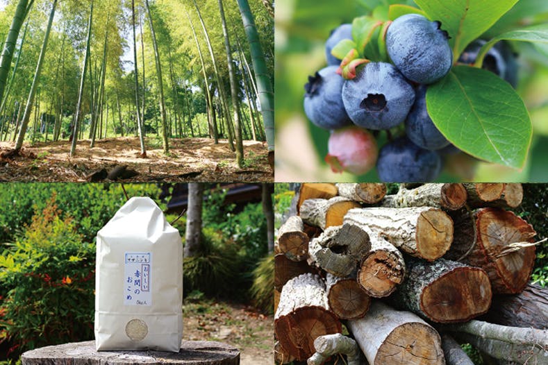 里山の代表格は竹林ですが、あかまの里山はたけのこ以外にもたくさんの作物が育っています。山菜、茶畑、きのこ類、西洋ワサビ、ナッツ類や、パッションフルーツ、ブルーベリーなどの果樹。育てている作物を挙げたらきりがなく、よくお客様に驚かれます。主軸のお米も5種類、季節野菜は必ず珍しい品種をいくつか栽培しています。