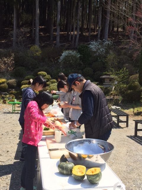 2019/04/16 17:40食事の準備も役割分担。 小学生も、中学生も、大学生も大人もみんなで食事の準備をします。「春夏秋冬の里」のイベントは、基本全員参加型です。野菜のカット、皮むき、味付け、調理などみんなで分担して行ないます。包丁の扱いが不慣れでも、誰も気にしない。じゃがいもが大きすぎても、それも個性。 おしゃべりしながら、そんな感じで進めると、爆笑がおきたりもします。みんなが集うと幸せがあふれ出します。 そんなイベントにあなたも参加してみませんか。もちろんひとりでも大歓迎ですよ。 ここでは自然もやさしいけれど、ヒトもあたたかい。お待ちしております。 もっと見る