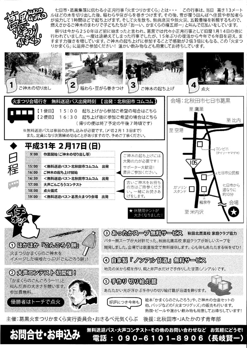 2019/02/21 14:46地域の子供たちの協力。復活以来の「葛黒火まつりかまくら」の特徴の一つに、地元地域の子どもたちの協力があります。葛黒集落を学区に持つ、北秋田市立鷹巣南小学校、北秋田市立鷹巣南中学校、秋田県立北鷹高等学校など、それぞれボランティア活動、郷土の文化を学ぶ授業の一環としてこのおまつりに関わってくれています。また今年は初めて学区外ではありましたが、北北私立綴子小学校の児童・父兄40数名も来てくれました。綴子小は児童たちが育てたお米の稲わらをおまつりにに提供してくれた縁からです。また南小学校では今回、「ぼくたちの地域」というタイトルの子どもたち手作りのパンフレットを作成し、おまつり会場で来場者に配ってくれました。もちろん火まつりかまくらのことも載っています。こんな子どもたちとのきずなも大切にしていきたいと思っています。 このたび、昼から協力してくれた子どもたちとその父兄は約百数十名になりました。それに対して休憩場所は農業用ハウス一棟と隣接の林業センターの広間だけでした。やはり休憩場所は欠かせません。次年度にはぜひゆっくりしたところを用意してあげたいと思います。ご支援どうぞよろしくお願いします。 もっと見る
