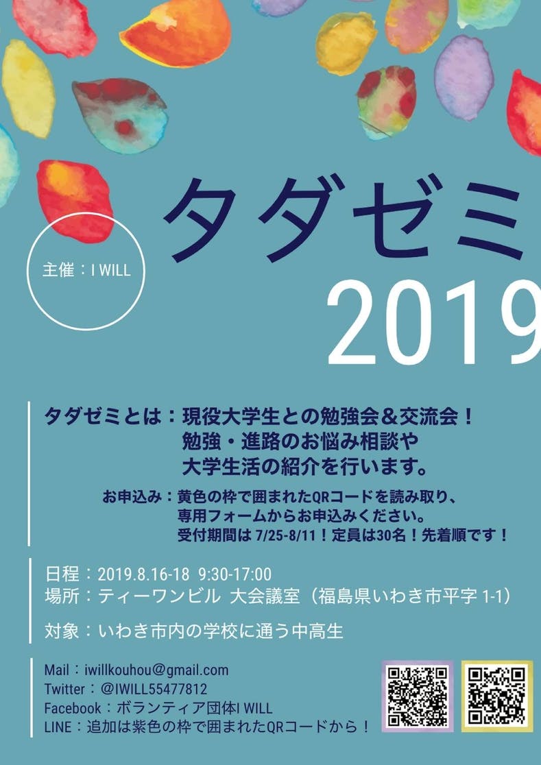 2019年の夏、私達I WILLで教育系ボランティア「タダゼミ」を実施します!