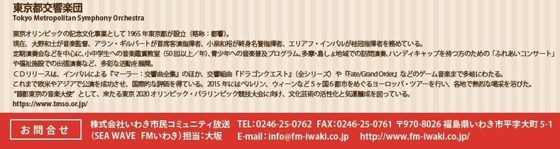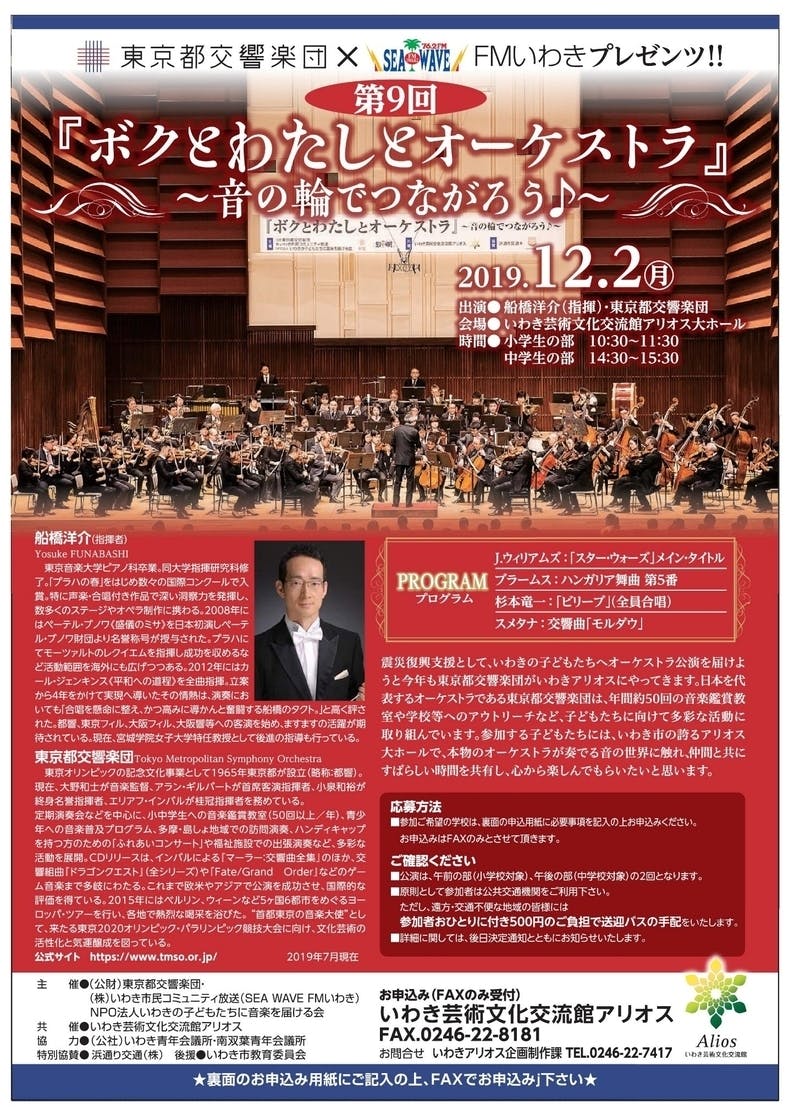2019/12/04 18:22今年で9回目を迎えた 都響 × FMいわき プレゼンツ「ボクとわたしとオーケストラ~音の輪でつながろう」。 午前の部で小学校18校、午後の部で中学校13校の合計およそ3700人が会場4階席まで埋まり、約1時間本物のオーケストラ演奏にふれました。いわき市内および双葉郡の小中学生による全員合唱「ビリーブ」は大人たちも圧巻。 本当に多くの方の協力でここまで成り立っていることを認識しました。今後も皆様にお力添えいただき、継続していくことができればと願っています。 日時/2019年12月2日(月)10:30、14:30場所/いわき芸術文化交流館アリオス 大ホール 指揮/船橋洋介お話/ベティ、鈴木智子J.ウィリアムズ:「スター・ウォーズ」メイン・タイトルオーケストラの楽器のお話ブラームス:ハンガリー舞曲第5番全員合唱 杉本竜一:ビリーブシベリウス:交響詩《フィンランディア》 op.26(アンコール)チャイコフスキー:バレエ組曲「くるみ割り人形」より「トレパーク」 写真/高橋智裕 特別番組のご案内 『ボクとわたしとオーケストラ』~音の輪でつながろう2020年1月12日(日)15:00~16:00(再放送: 2020年1月13日(月)20:00~21:00) FMいわきホームページ http://www.fm-iwaki.co.jp/ インターネット サイマル放送 ※FMいわきはパソコンからお聴きいただけます。 http://simulradio.info/#touhoku もっと見る