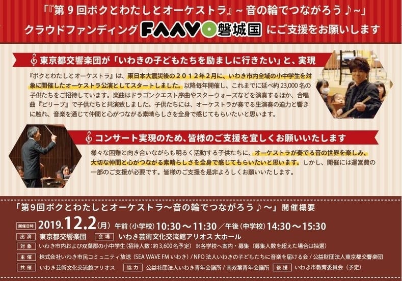 2019/12/27 06:06この度はFAAVO磐城国プロジェクト「いわきと双葉郡の子どもたちにフルオーケストラ音楽を届けたい!」に応援してくださり誠にありがとうございます。 大変お待たせいたしました。当プロジェクトにご支援をいただいた方々への返礼品の発送を開始いたしました。 今年も残すところ残りわずかとなりました。 皆様どうぞよいお年をお迎えください。 特別番組のご案内 『ボクとわたしとオーケストラ』~音の輪でつながろう2020年1月12日(日)15:00~16:00(再放送: 2020年1月13日(月)20:00~21:00) FMいわきホームページ http://www.fm-iwaki.co.jp/ インターネット サイマル放送 ※FMいわきはパソコンからお聴きいただけます。 http://simulradio.info/#touhoku もっと見る
