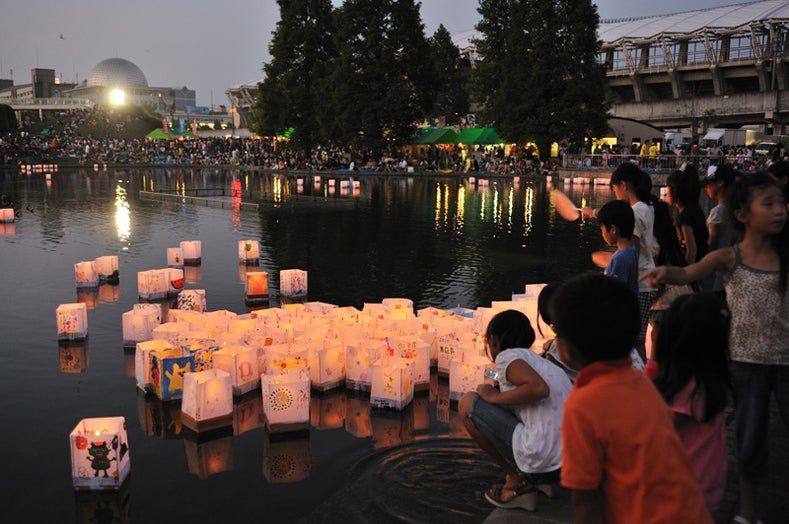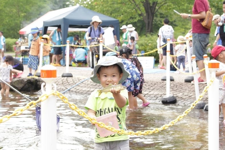 親子で気軽に乗車できる、ミニSL体験は特に小さな親子連れに人気のコーナーになっています。鮎のつかみ取り体験は、30年近く続いている、ふるさとまつりの名物です。小学生限定で、池に放った鮎をつかみ取りし、塩焼きで食べます。ユアテックスタジアム近くの泉ケ池では、夕方から灯篭流しがあります。事前に制作した灯篭を池に流す風景は幻想的です。