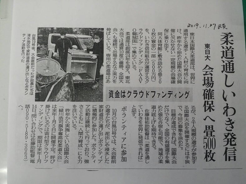 福島県いわき市は、朝方と夕方の冷え込みがだいぶ厳しくなってきました。 インフルエンザも感染の注意報が発令されたそうです。 感染しないよう、手洗いうがいの徹底や人込みを避けること、マスクの着用等学生に周知したいと思います。 幸いにも学生の感染者はまだでておりません。 感染していても気づかない学生も居るくらいの精神力と身体の強さを持っているだけに、集団感染を避ける努力はしていきます。 さて先日、福島民友さんにこの度のクラウドファンディングについて掲載していただきました。 学生が水害地域でのボランティア活動をしている写真も掲載していただきありがとうございます。 新聞掲載の力はすごく、既にお問い合わせも頂いています。 目標金額達成のために、引き続き頑張ります。 福島民報さんにも掲載されていますので 是非ご覧ください。