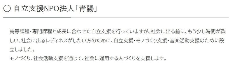 NPO青陽では発達障害・学習障害・不登校・引きこもり学生の自立を応援しています。その人だけの特化した技能を習得、スキルを活用して、作品を商業ラインに乗せることで自立の道を探したいと考えています。