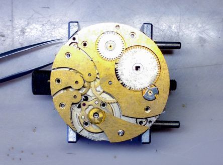 各部分のブリッジに足をつけ、ルビーが圧入される部分に穴位置合わせた後、治具ボーラーで穴あけをして行くあたりです。 各穴センターは無事出ていました! 一本目完成までもう少しです。