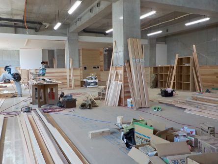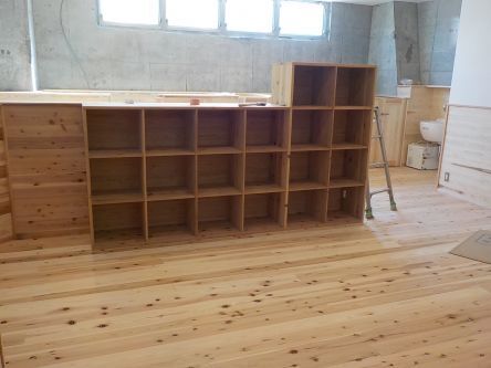 今日も大工さんの懸命な作業が続いています! 仕切り、棚、入口の扉と すべて木材が使用されています。 子どもたちが過ごす光景が想像できるまで 仕上がってきました!!!