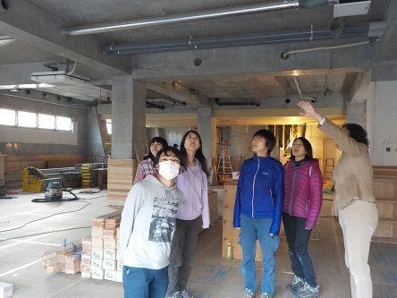 目標達成の知らせを聞いて、保育者たちも施設見学へ。みんなわくわくしながら園舎を見て回りました。子ども達がこの中で遊びまわる様子が早く見たいですね!