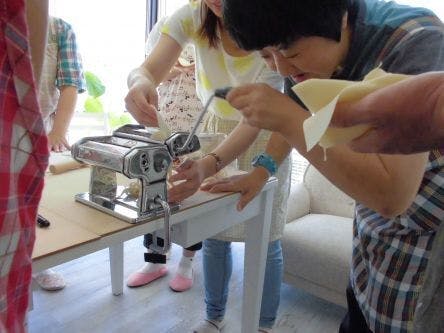 パスタマシンも意外と難しい・・・!油断すると生地がねじ込まれてボロボロになってしまいます。
