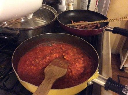トマトソースもちゃんとソフリット(タマネギ、セロリ等の香味野菜を長時間炒めたベース)から作っています。