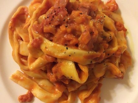 ↑の写真はベーコンのトマトクリームパスタ