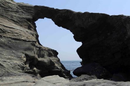黒やピンクの火山灰層を追いかけ,So凝灰岩から470万年の火山活動を想像し,火山豆石の存在を確認し,馬の背の洞門から見た「青い海」と「遙か彼方の房総半島」に,歓声があがりました。