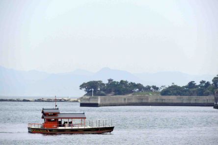 平成10年に就航した朱塗りの「愛宕丸」に乗船して対岸の