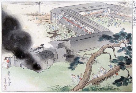 この「震後津浪襲来 逗子小坪所見」は,[絵巻物出版1926)]『大正震災畫集 第3集 』(国立国会図書館所蔵)として有名ですが,当初は「列車転覆大磯附近」『大正震災畫集 第4集』との2枚をセットにして,[日本版畫社(1924)](国立国会図書館所蔵)から販売されました。紫雲は,体験画と想像画をセットで販売したのです。列車転覆の写真をスケッチして,避難する人々の様子を想像して描いたことを,コメント付きの大正震災畫集に残しました。手前にある松の樹は、東海道の松並木とおもわれます。(東京都慰霊堂協会 復興記念館の『状況絵画』として2014年に展示されました。