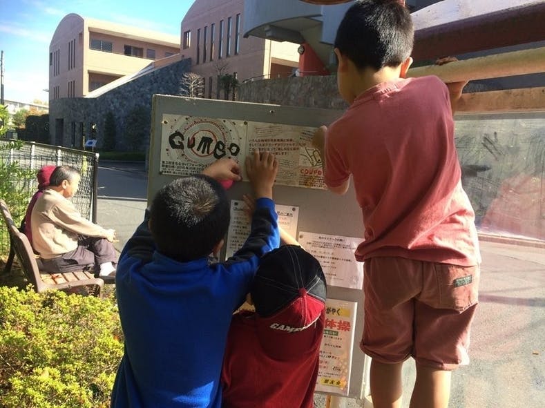 たまプラーザ団地内の掲示板にGUMBOチラシを貼りに行こうと思っていたら、公園で遊んでいる 「Bブラザーズ」をみっけ!声をかけたら、「チラシ貼りた〜い!」ってことで「チラシ貼り隊」に(笑)。3人のチームワークの良さは兄弟ならでは、とても素敵な家族の姿が見えてきました。