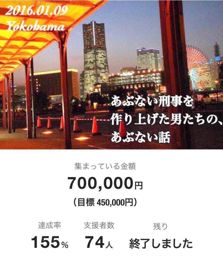 2015/12/16 11:5712月15日(火)当初の設定金額を大きく上回る70万円という金額を達成し応募期間を終了することができました。皆様の熱いご支援に、大変感謝いたします!おかげさまでイベント運営の経済面で2009年の前回に比べとても楽になりました。イベントまで残り少ない日にちですが、スタッフ一同、イベントを成功に向けて頑張ります。また、当日会場に来られない方にも、DVDのご支援いただいた方には付属のDVDによって当日の模様をお伝えできるように撮影班を用意し、これを記録に残します。今回のクラウドファンディングご支援いただき本当にありがとうございました。1月9日のイベントよろしくお願いいたします。ハードボイルドヨコハマ代表 秋山健 もっと見る脚本の柏原 寛司さんにノベライズ本についてインタビュー