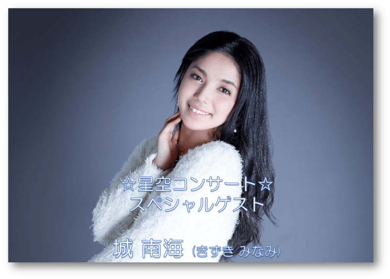 お祭りには音楽も欠かせないと言うことで、“星空コンサート”のスペシャルゲストは奄美大島出身の歌姫“城南海”さんです。城さんの「美しい歌声と星空」の感動の共演を是非お楽しみください♪