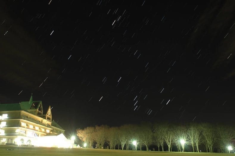 【会場のふれあいの丘での星空、奥に見えるのはシャトーエスポワール(宿泊施設)】