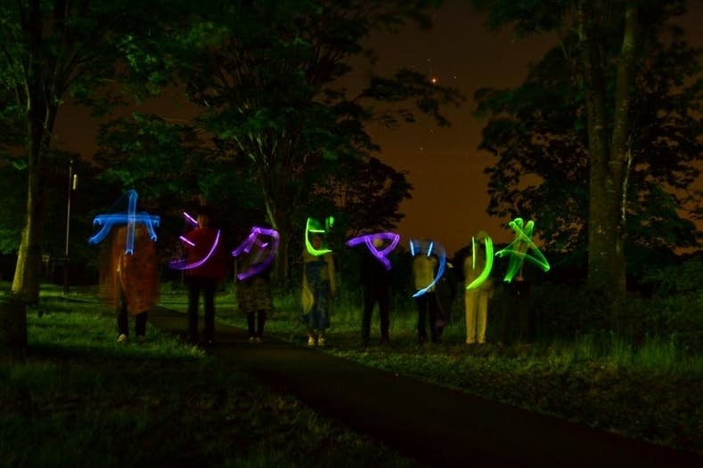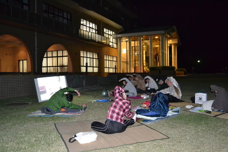 第3弾「星空シアター」開催(5/14)・・・芝生に座りみんなで映画鑑賞を楽しみました。宇宙に関する内容の映画でとても公表でした♪最後に、光る棒を使い皆で「ホシタビマツリ」と書いた写真が思い出です☆