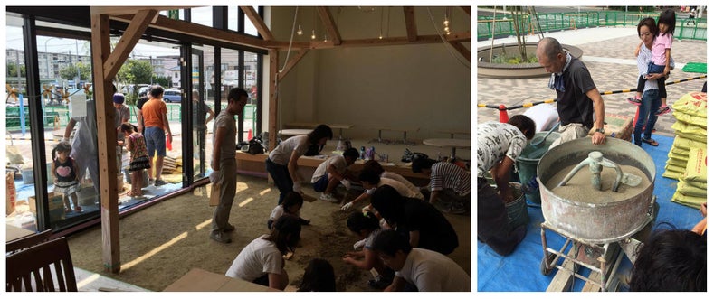 いずみ野の親子10組のみなさんに、お店の真ん中の土間スペースの作業を手伝ってもらいました。