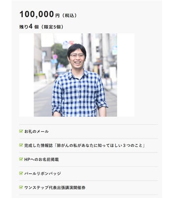 この企画を成功させるうえで、とても大切なことがあると思っています。禁煙や検診などいろいろ書きましたが「肺がんの私があなたに知ってほしい3つのこと」が示すメッセージは、一言でいえば「大切な人のために、まず自分自身を大切にする」ということです。そのため、リターン品はこの情報誌自体として、まず協力していただいたみなさんに読んでほしいと思っています。そして大切な人のために、自分自身が行動を起こす。そして、その次、この情報誌を皆さんの大切な人に渡してほしいのです。そして、大切な人の行動を後押ししてほしい。お互いを思いやり、自分自身を大切にする、本当の意味での目標と考えています。11月が世界的な肺がんの啓発月間です。1年に1度肺がんのことを考える、そんな月になればいいなと思います。