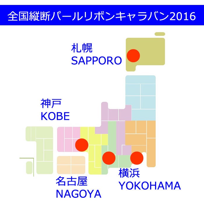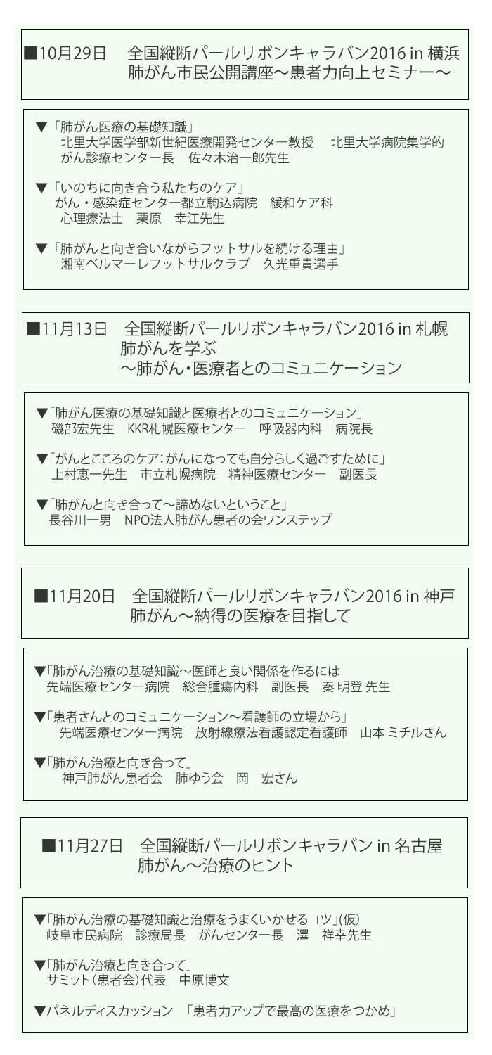 世界的な肺がん啓発月間である11月に行うのは情報誌だけではありません。「全国縦断パールリボンキャラバン2016」というタイトルで全国4か所、市民公開講座を行います。